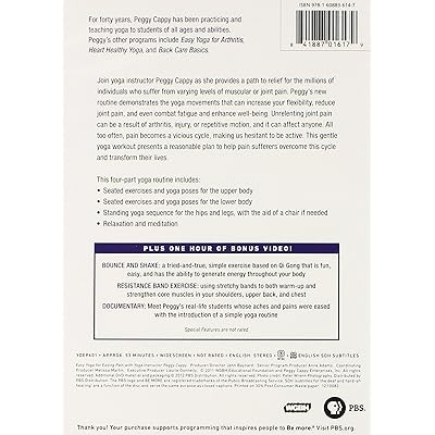 This video clip is contains additional information. Just as peggy cappy has modified yoga poses in her earlier videos yoga for the rest of us and more peggy shows you the right exercises and yoga poses to protect your back and improve your posture. We manually verify comments and will ban ips that try to mess with us.) back care basics_08 about peggy cappy.avi. Use it in the morning or at night and discover how easily yoga can be incorporated into your daily routine and how quickly youll see the benefits for your body and spirit. This product can expose you to some chemicals, which is known to the state of california to cause for more information, go to www.p65warnings.ca.gov.? Join yoga instructor peggy cappy as she provide a path to relief for the millions of individuals who suffer from varying levels of muscular or joint pain. Peggy created yoga for the rest of us because of her interaction with a special group of senior citizens that she has been teaching for sixteen years. Ease your back and improve your posture! Also, your attention is invited to the section where you can learn the full yogic breathing. Join yoga teacher peggy cappy as she demonstrates movements to use at home to strengthen muscles and help increase mobility for people who this gentle yoga routine is perfect for people of all ages and abilities as peggy's unique approach allows for three modifications for each pose: Peggy cappy demonstrates the right exercises and yoga poses to protect the back and improve posture. Peggy's new routine demonstrates the yoga movements that can increase your flexibility, reduce joint pain. The secret to strength and balance with peggy cappy (dvd).